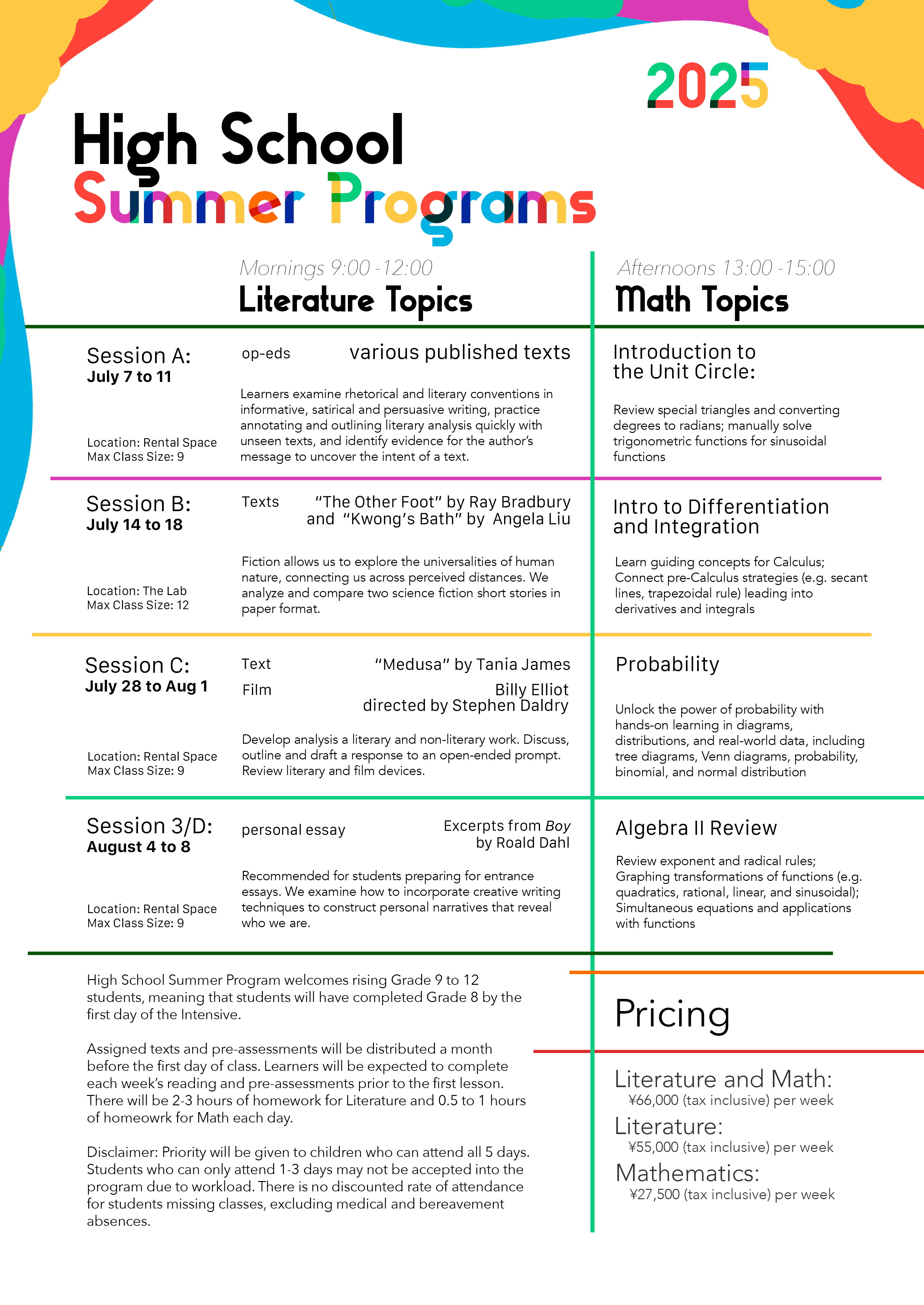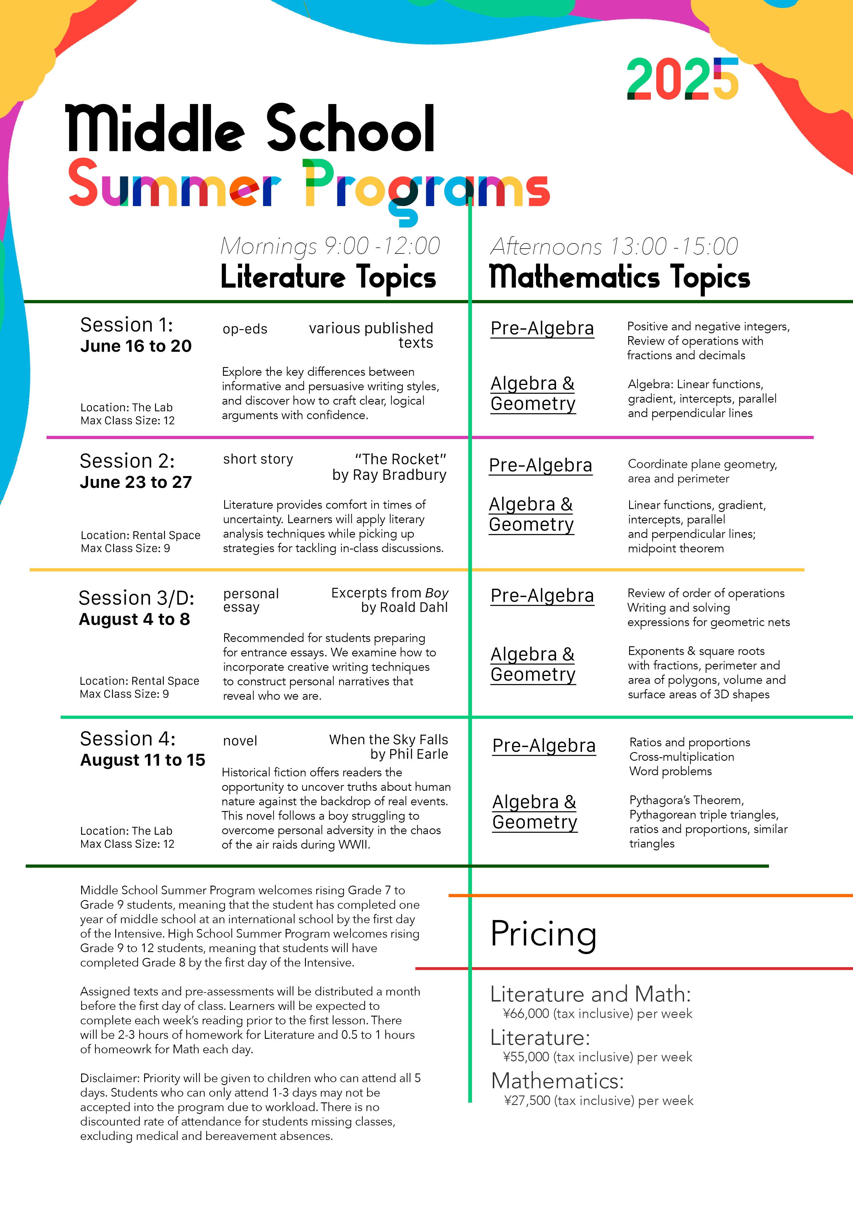 The Middle School and High School Summer Intensive Programs cover the skills needed to succeed in literature and mathematics programs in the International Baccalaureate and AP System.
